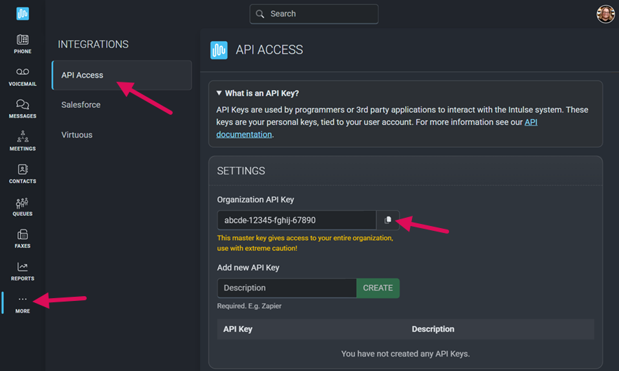 To begin the integration process, the first step is to either sign in or sign up for Intulse and obtain the Master Key. To locate the Master Key in Intulse, click on the 'More' option, followed by 'API Access.' On this page, you will find the Organization API Key. Copy this key for later use.