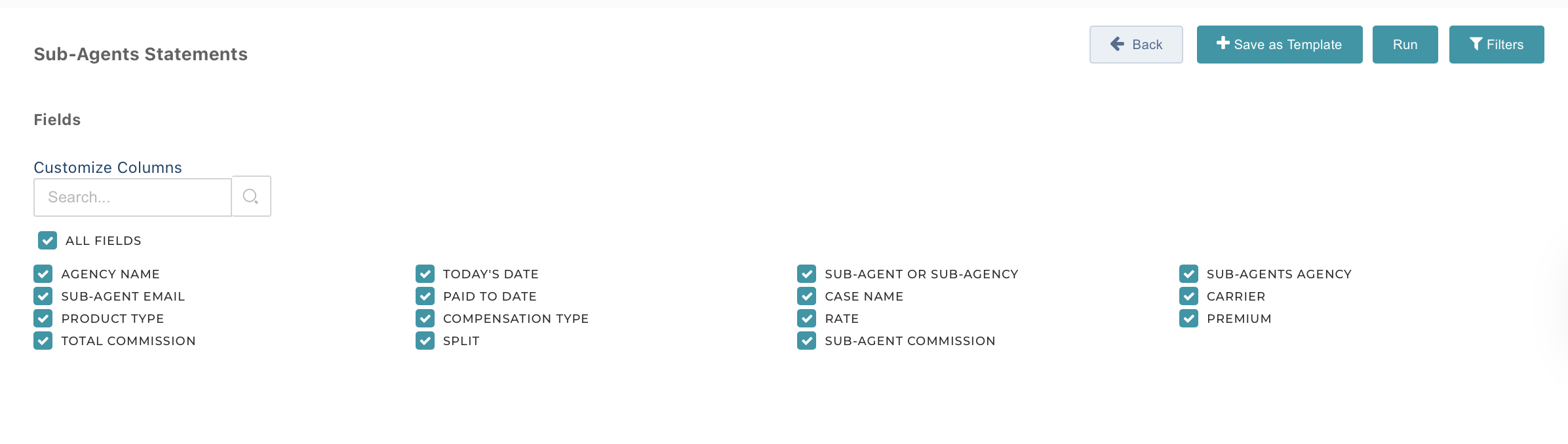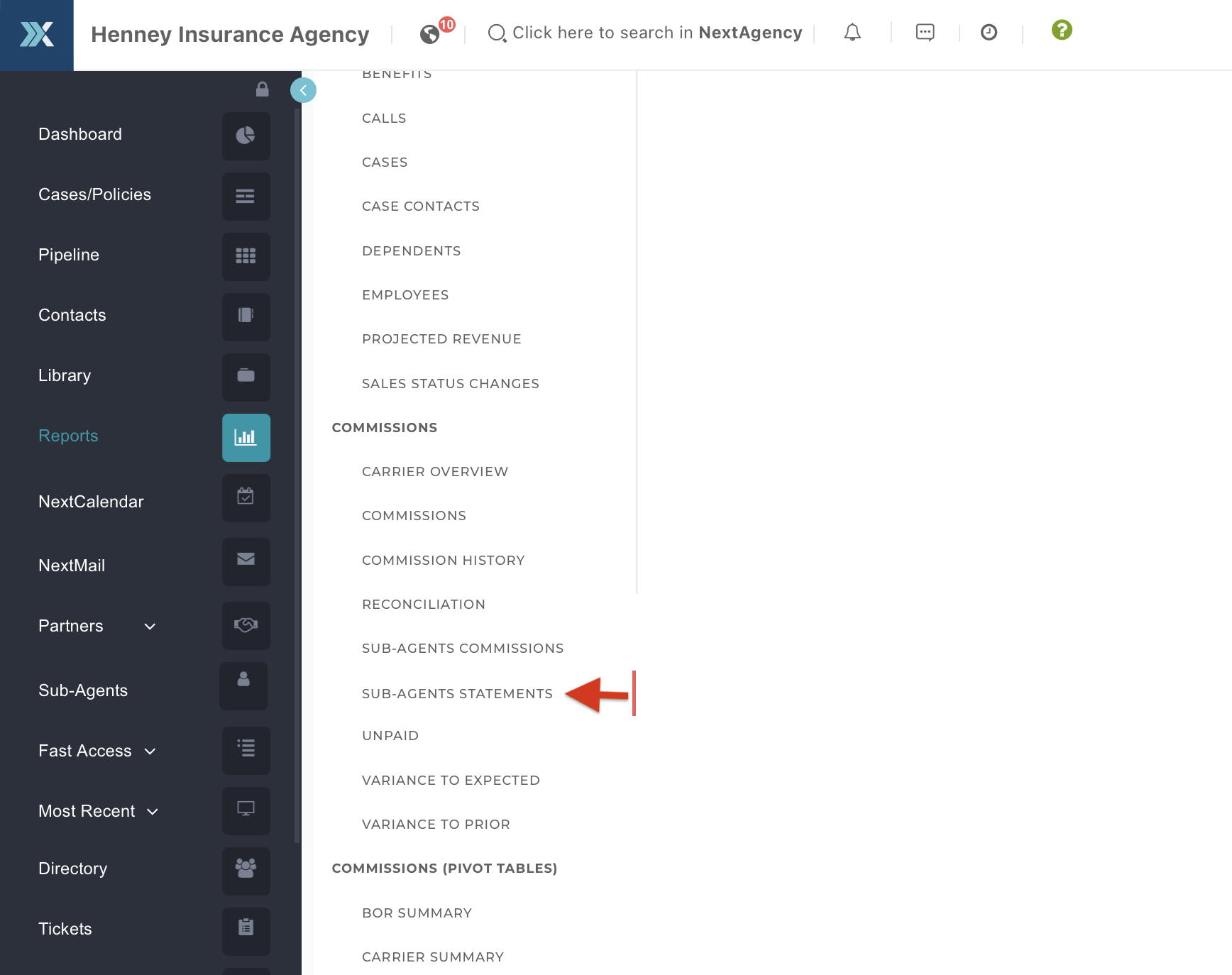 The Sub-Agent Statements report is available under the Commissions section of the Reports. This report is designed to simplify the process of generating commission statements for sub-agents.