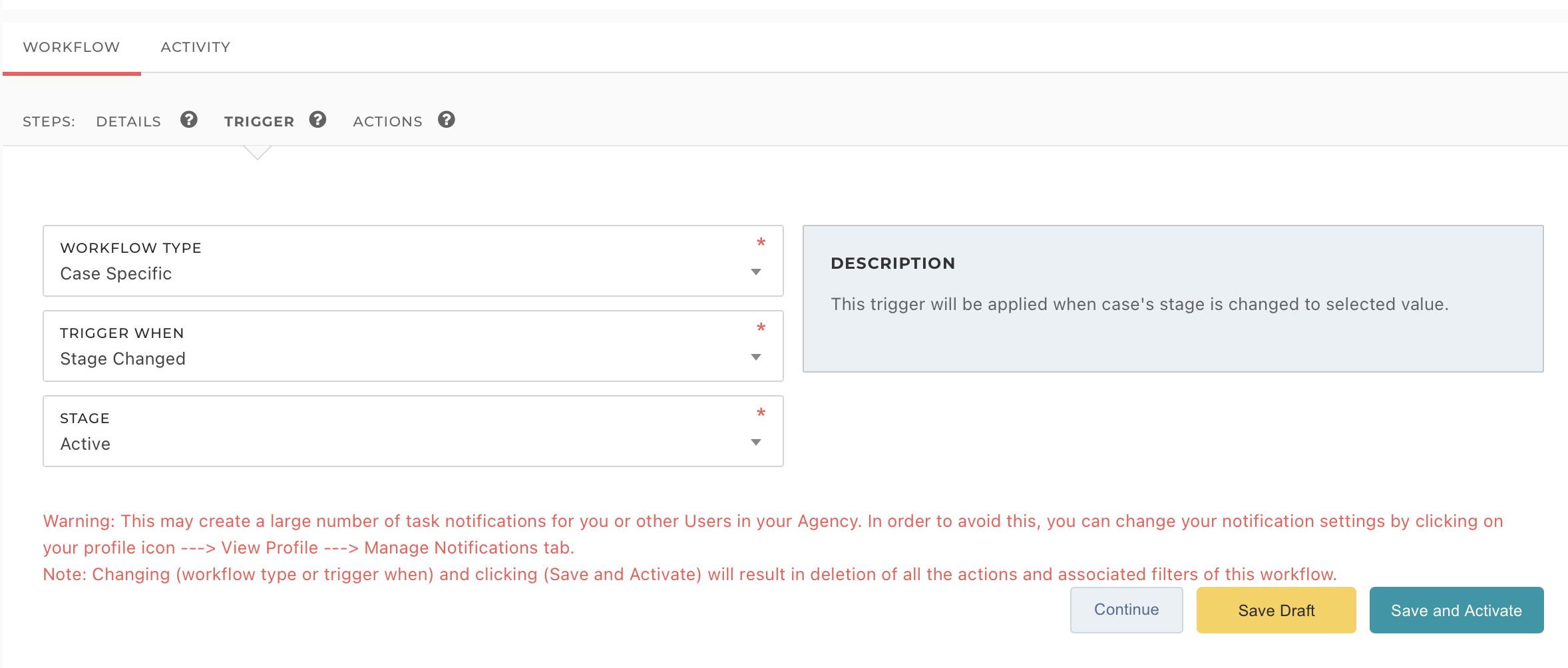 Trigger tab: Next, configure the trigger conditions. In this example, the workflow is case-specific and is triggered when the case stage changes to Active. You may also create workflows based on other scenarios, such as effective or renewal dates, birth dates, and more. You can learn more about Workflows here. Click Continue to proceed.
