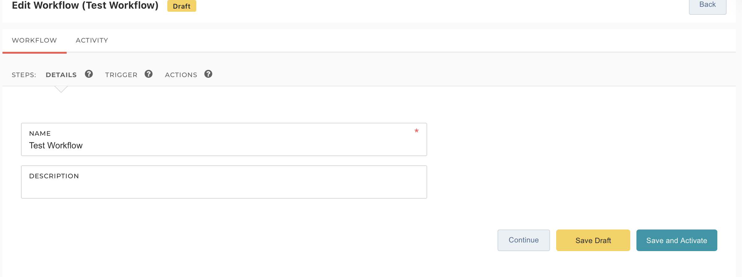 Details tab: Enter a workflow name and an optional description.