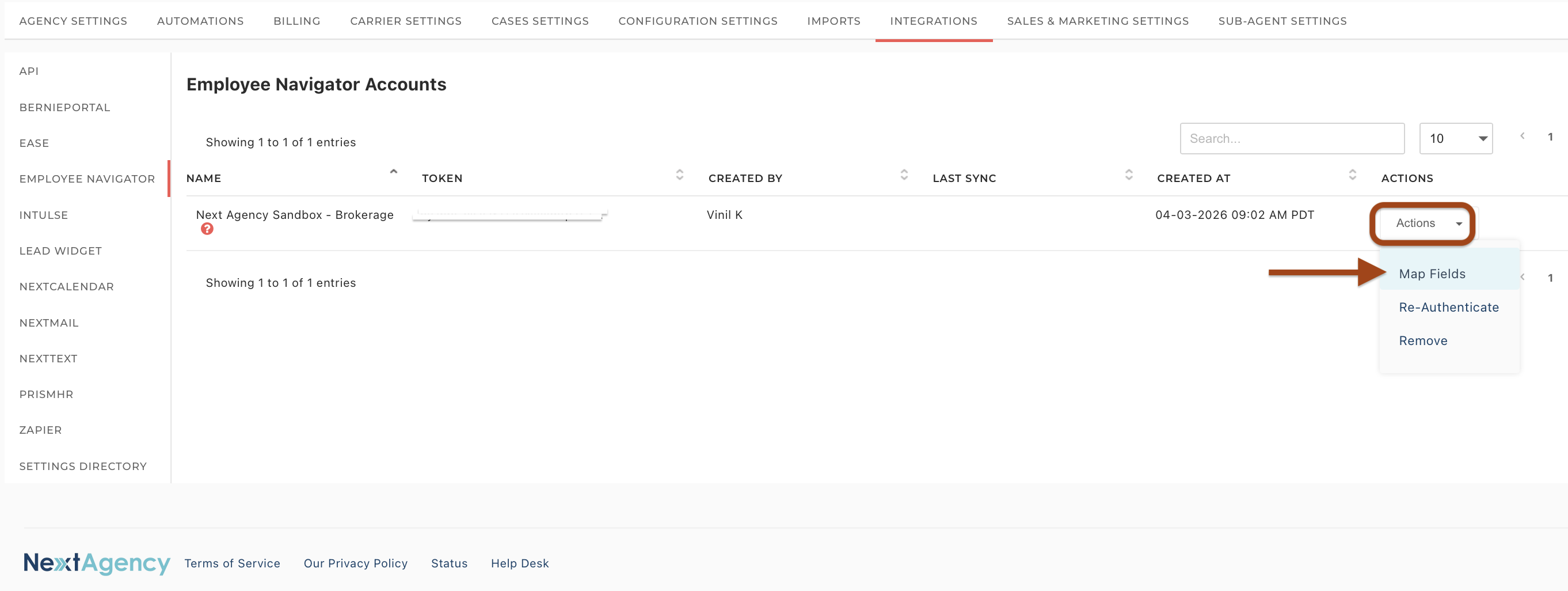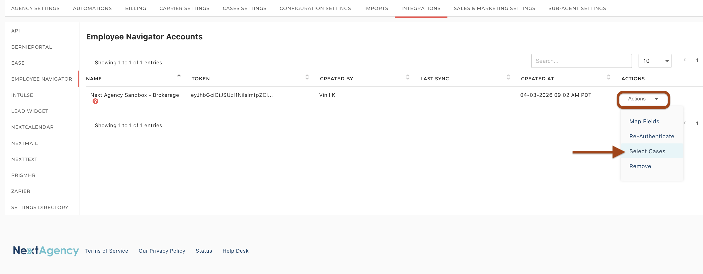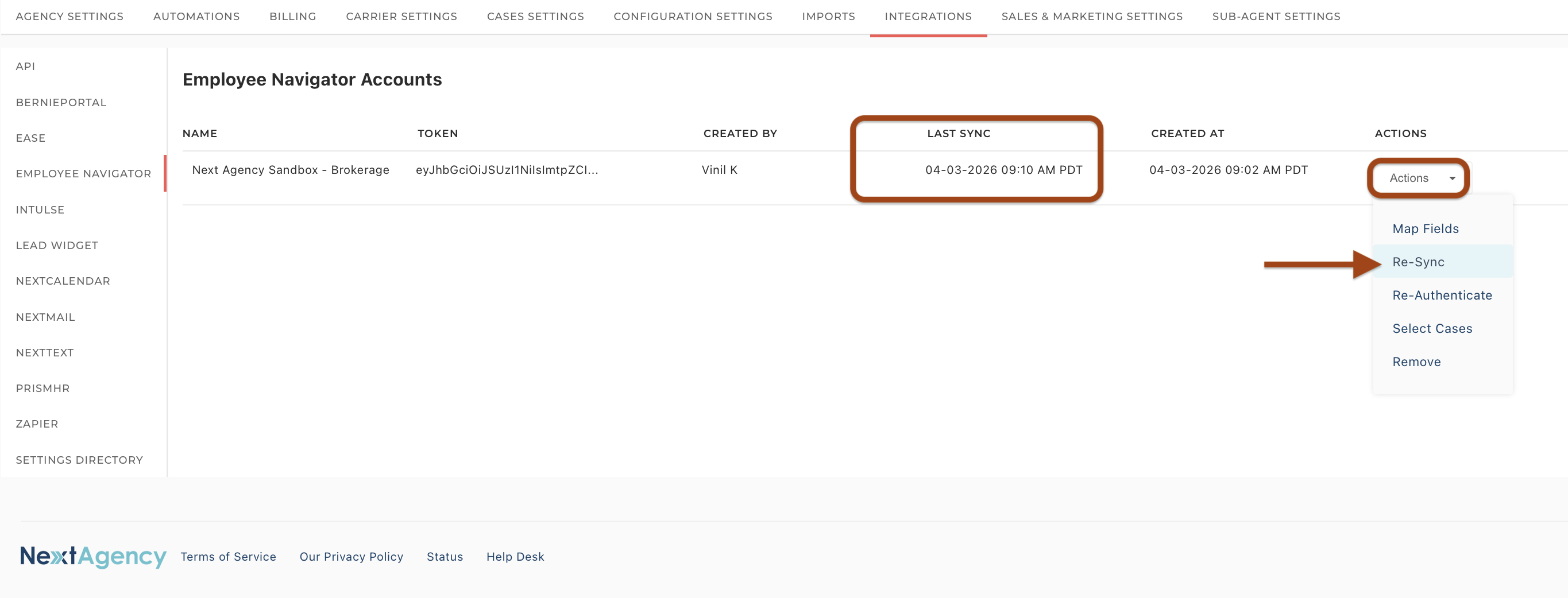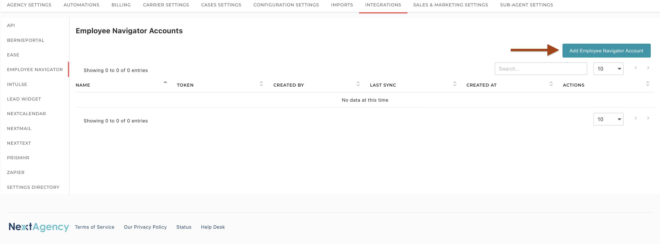 The Employee Navigator integration must be enabled on your NextAgency subscription. Contact support if you do not see the option.