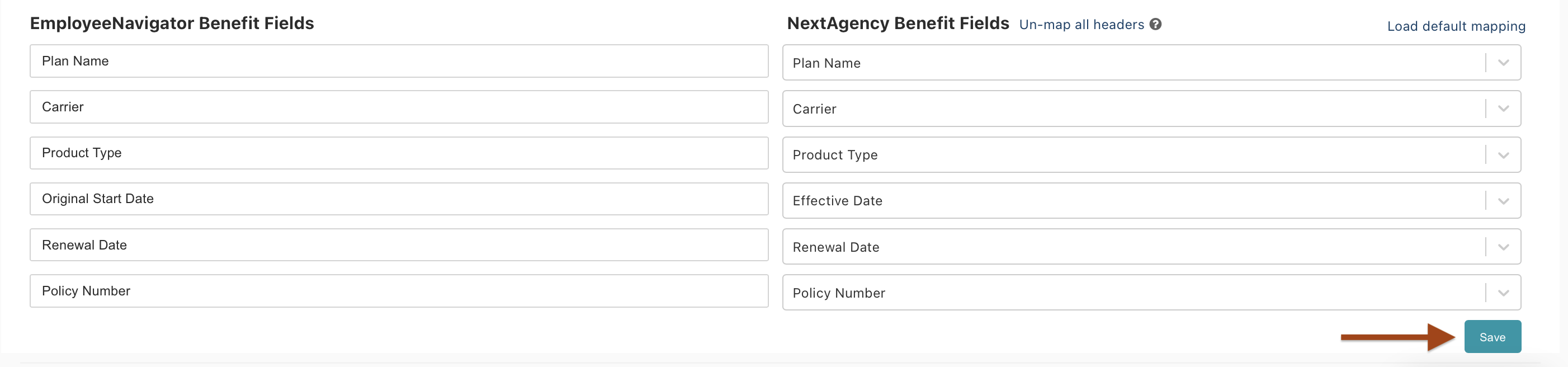Maps Employee Navigator plan data to NextAgency Benefit fields. These fields should be mapped to ensure benefits are created and deduplicated correctly: