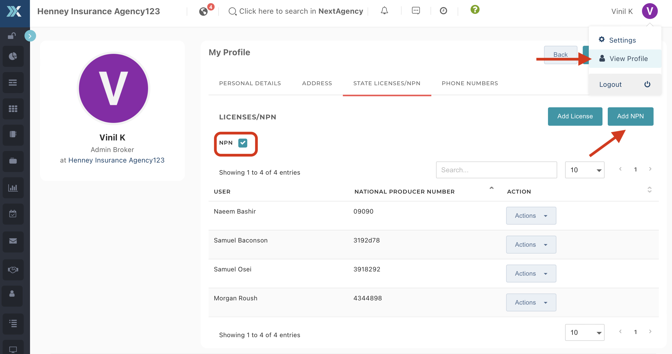 - Under the State Licenses tab, ensure the NPN field is filled. If necessary, click Add NPN to enter or update this information.
