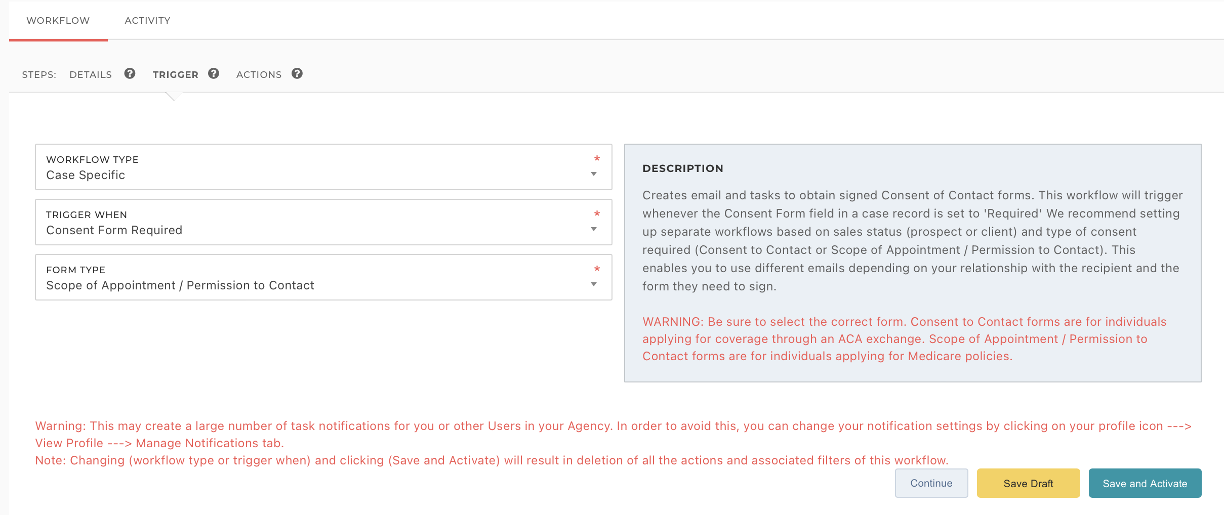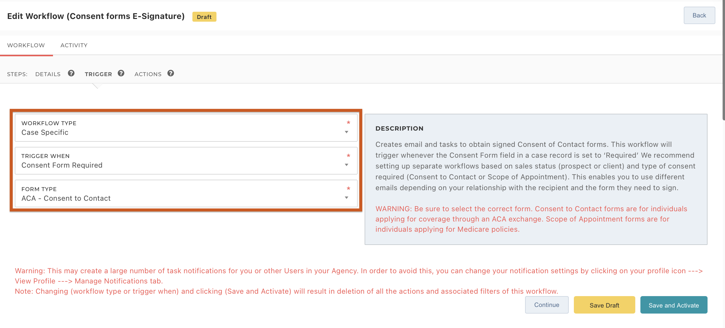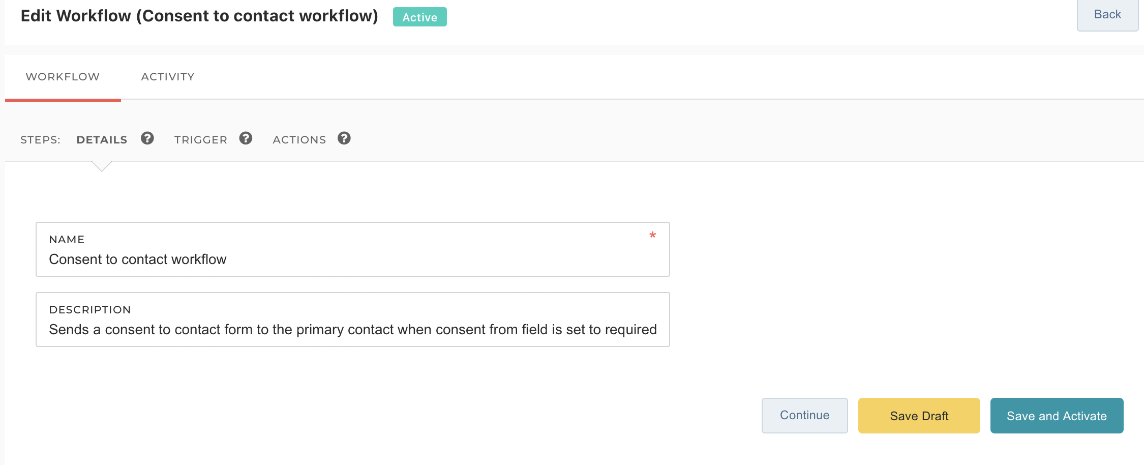 - Click 'Save as Draft' to save your workflow, but not activate it. Click on 'Save and Activate' to implement your workflow.