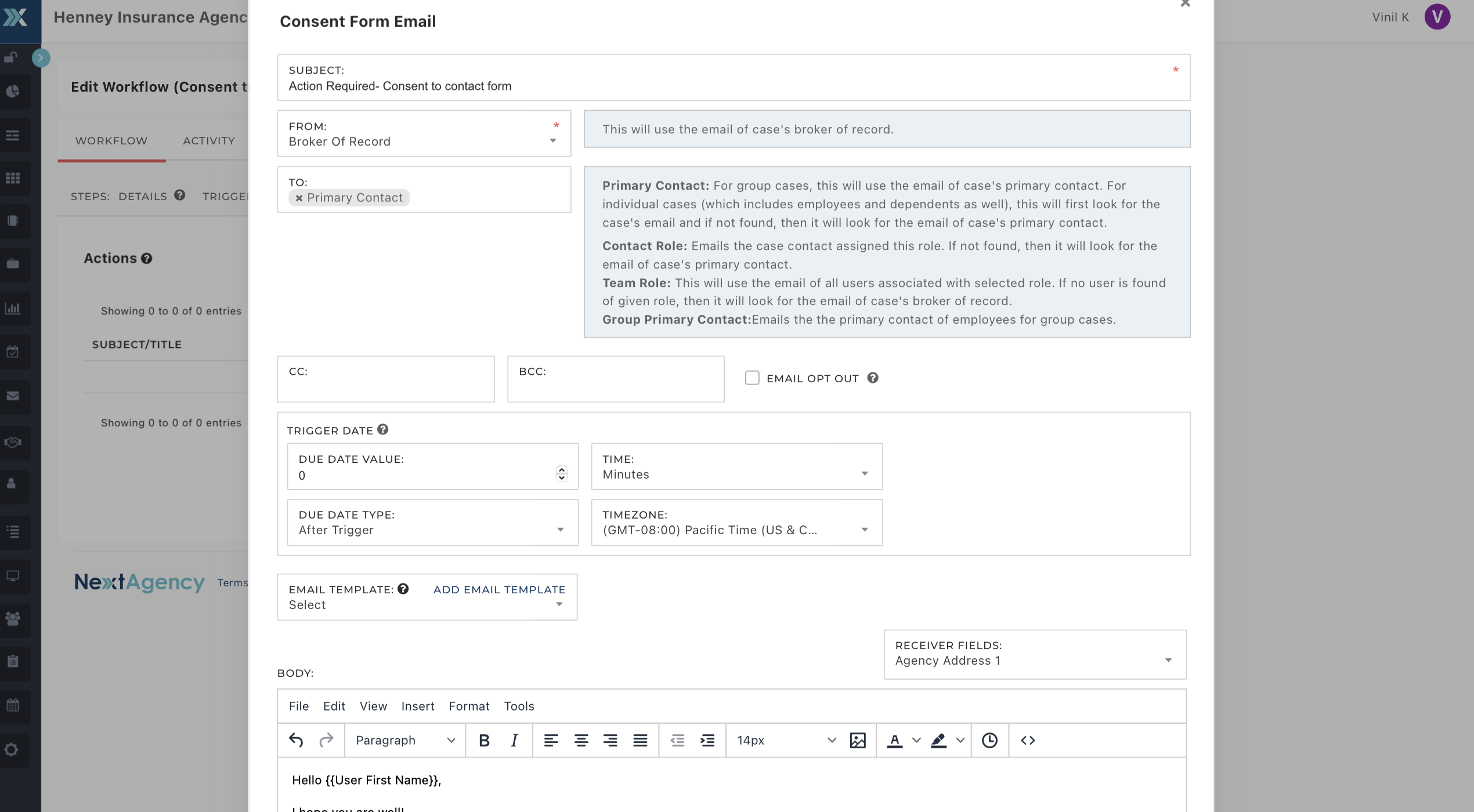 - Specify the recipient and set the trigger date for when the email should be sent. Setting the due date value to zero sends the email immediately upon changing the Consent Form field to required in the Case record.