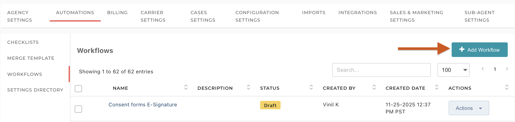 To start, go to Settings (top right or in the blue navigation pane) > Automations > Workflows, then click Add Workflow.
