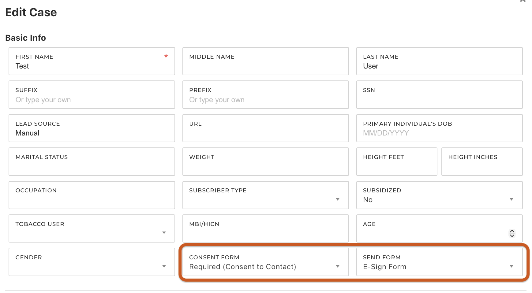 2. In the Consent Form field, choose the appropriate option.3. If 'Required (Consent to Contact)' or 'Required (Scope of Appointment/Permission to Contact)' is selected and you have at least one active consent form workflow, a new field labeled 'Send Form' will appear with the value of 'Consent Form'.